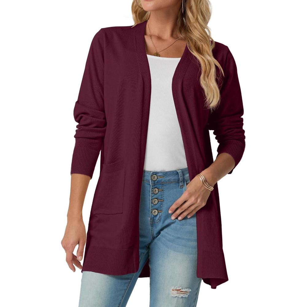 GRECERELLE Womens Lightweight Open Front Casual V-Neck Long Cardigan Sweater with Pockets, S-2XL(Burgundy)