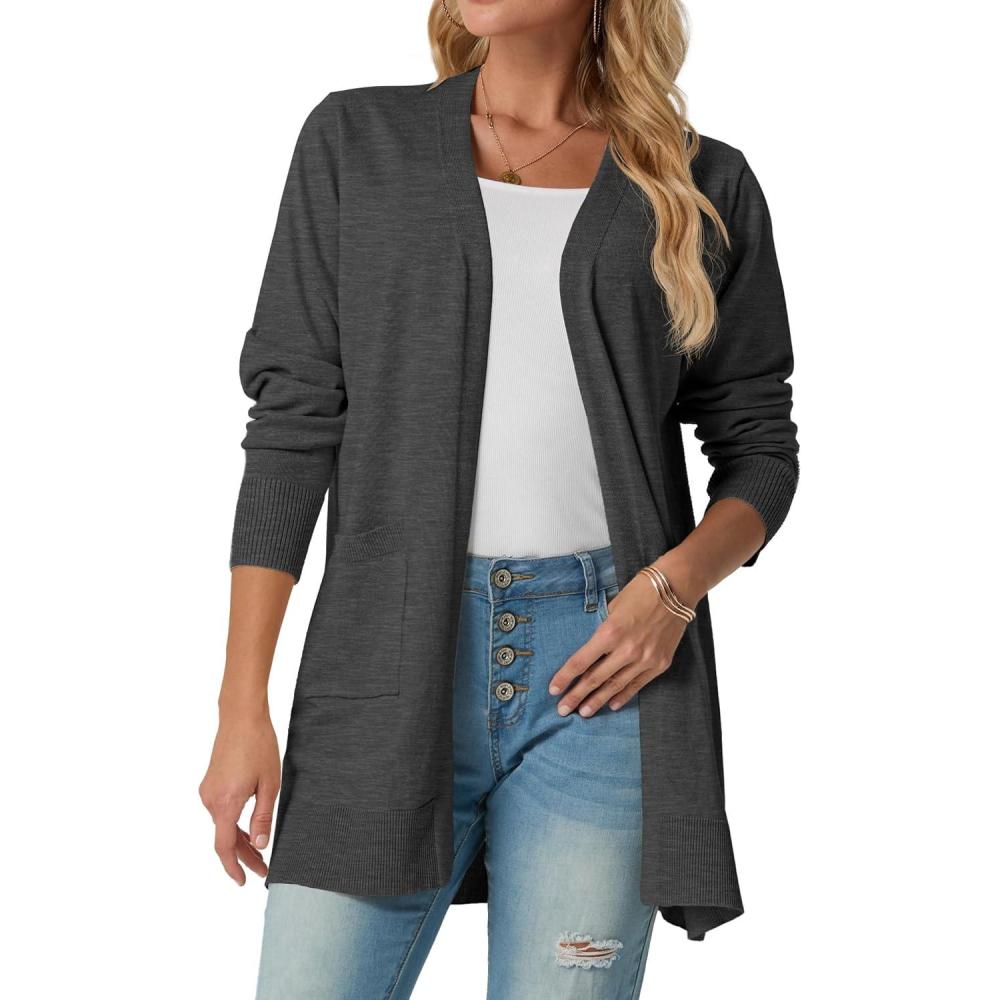 GRECERELLE Womens Lightweight Open Front Casual V-Neck Long Cardigan Sweater with Pockets, S-2XL(Charcoal)