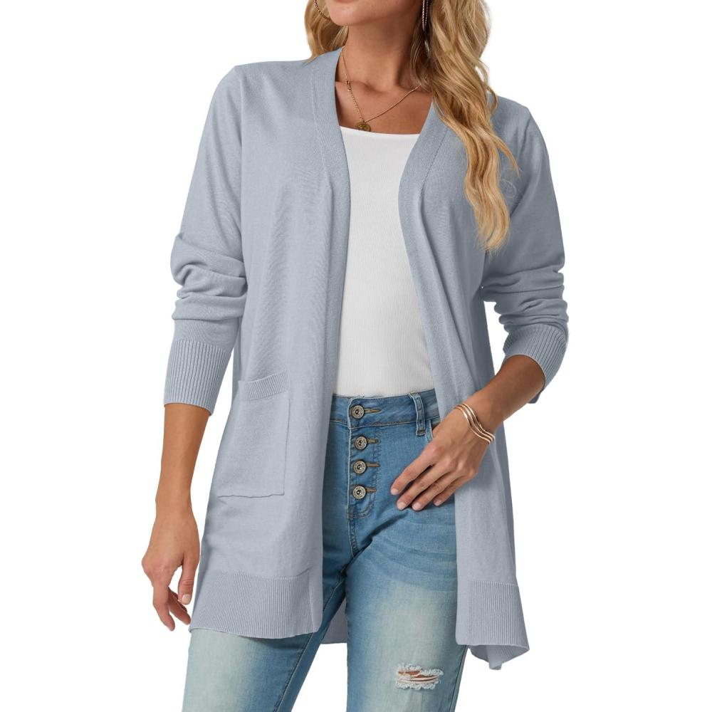 GRECERELLE Womens Lightweight Open Front Casual V-Neck Long Cardigan Sweater with Pockets, S-2XL(Grey Blue)
