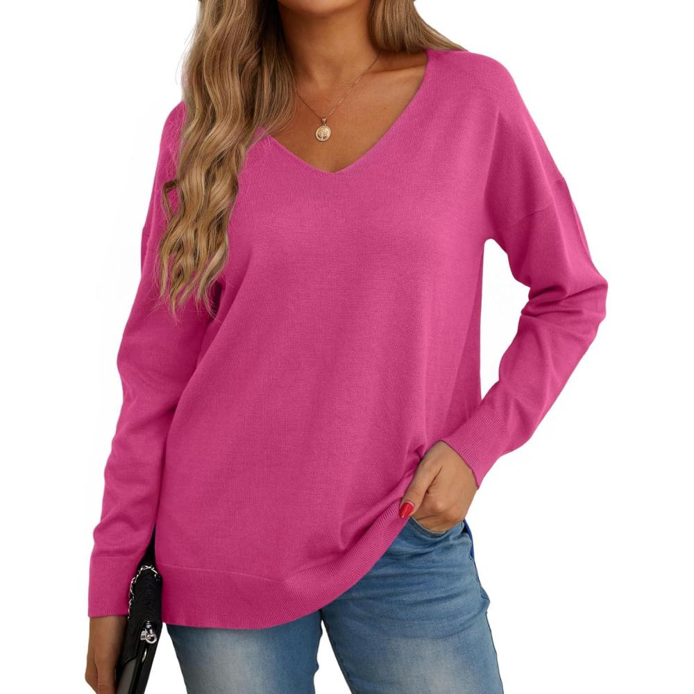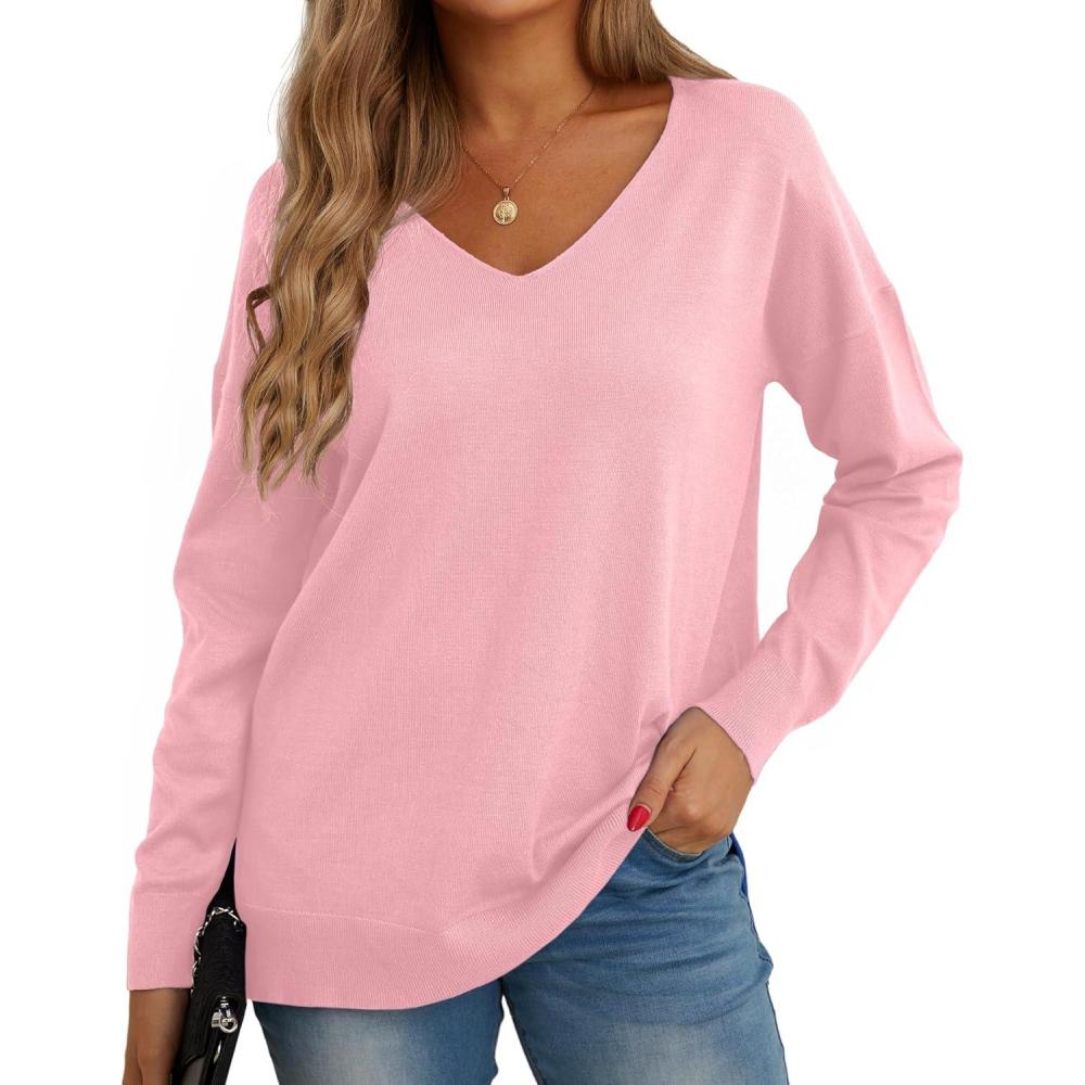 GRECERELLE Women’s V-Neck Long Sleeve Side Split Loose Casual Knit Pullover Sweater Blouse(14 Pink)