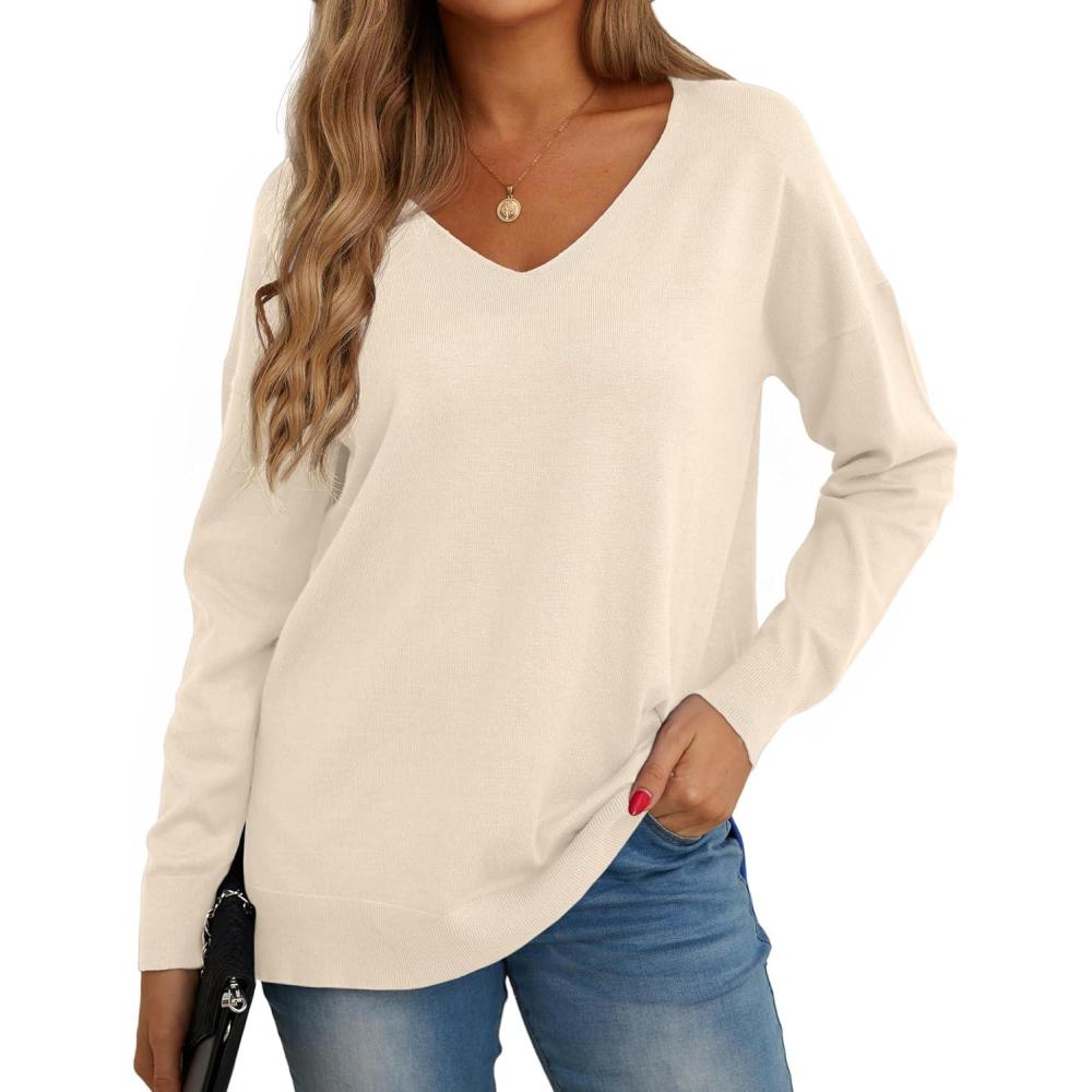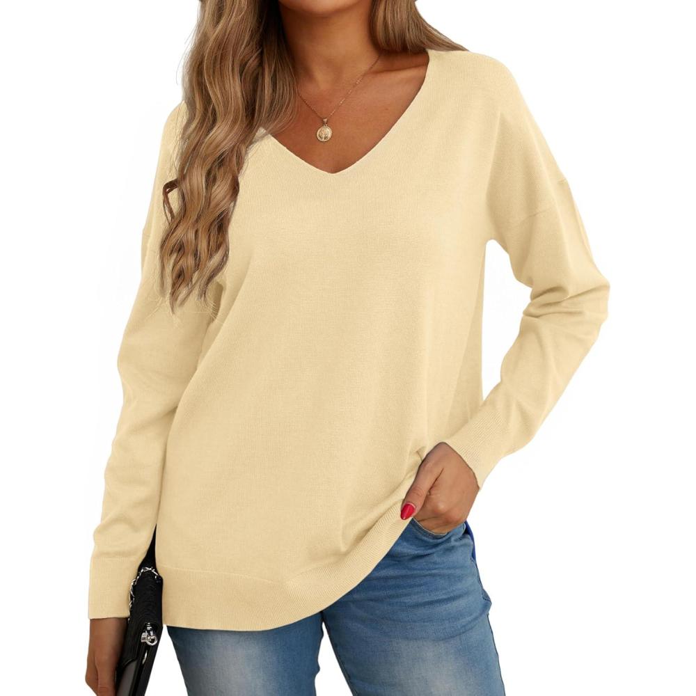 GRECERELLE Women’s V-Neck Long Sleeve Side Split Loose Casual Knit Pullover Sweater Blouse(Apricot)
