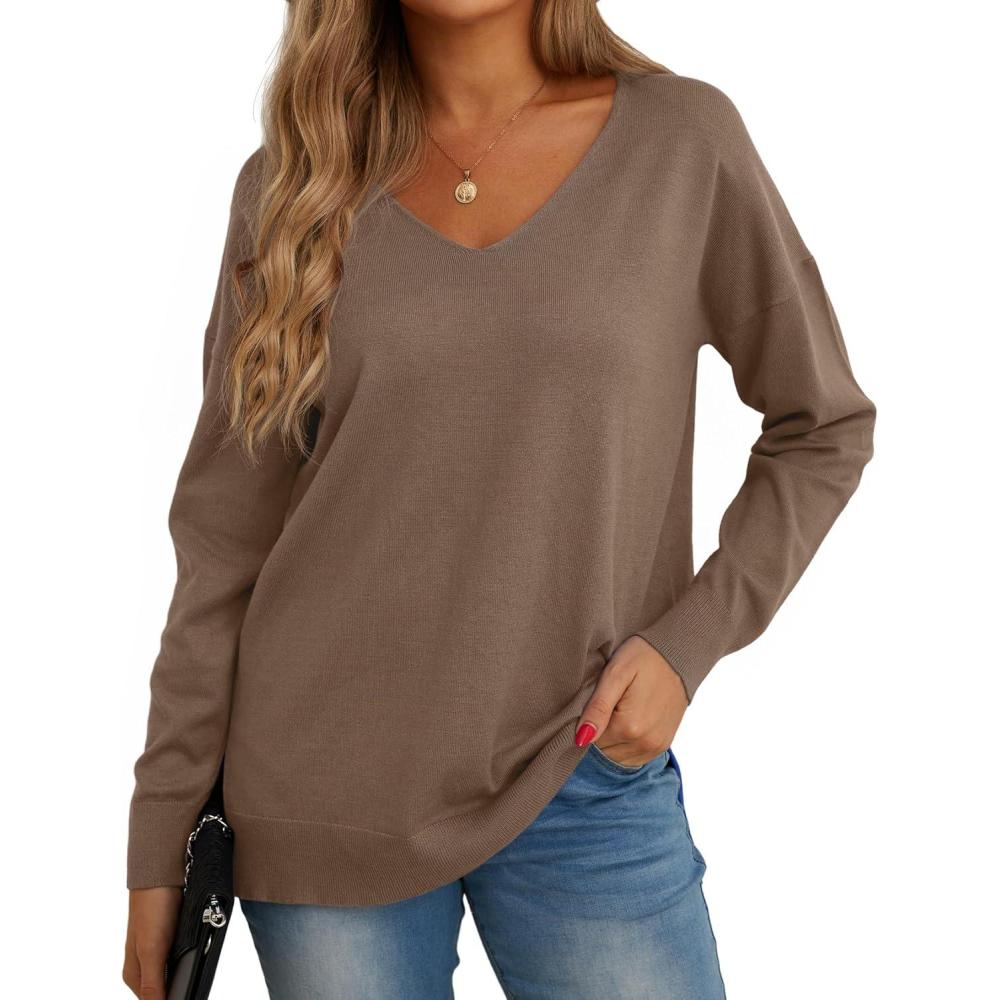 GRECERELLE Women’s V-Neck Long Sleeve Side Split Loose Casual Knit Pullover Sweater Blouse(Chocolate Brown)
