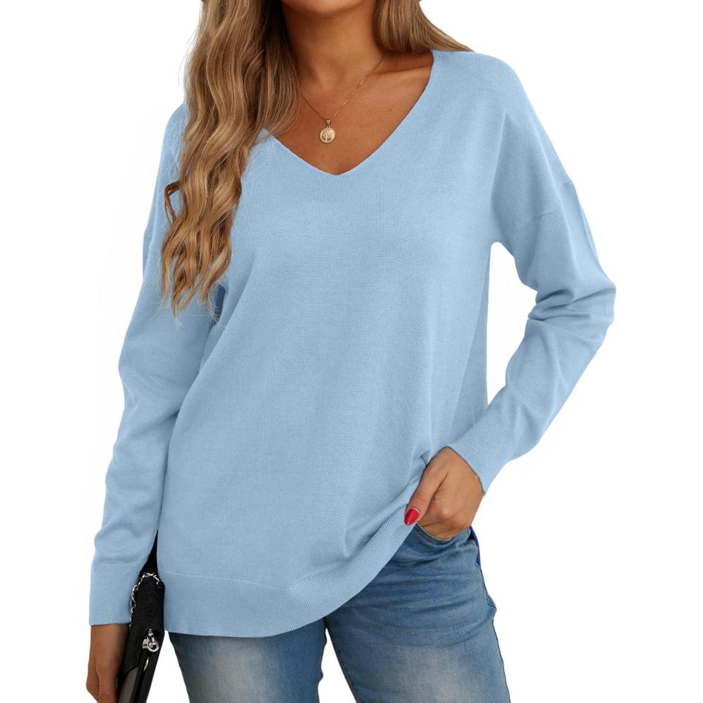 GRECERELLE Women’s V-Neck Long Sleeve Side Split Loose Casual Knit Pullover Sweater Blouse(Light Blue)