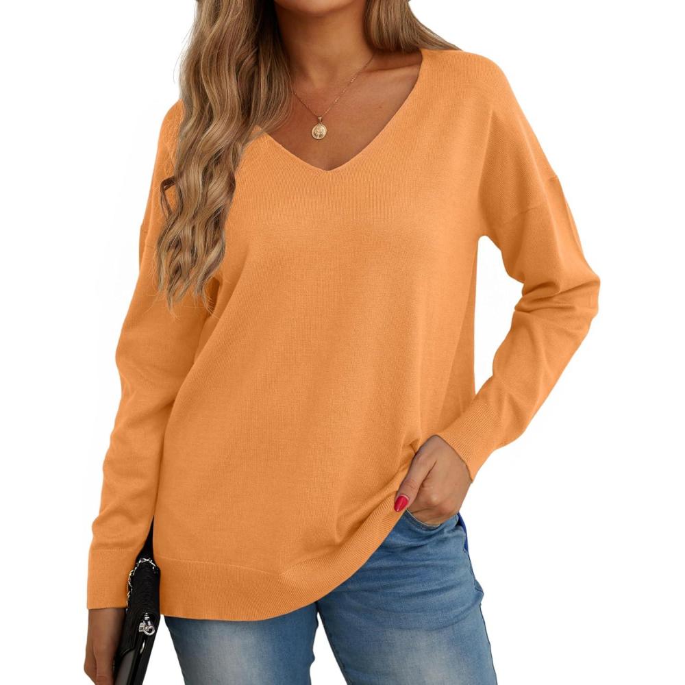 GRECERELLE Women’s V-Neck Long Sleeve Side Split Loose Casual Knit Pullover Sweater Blouse(Light Orange)