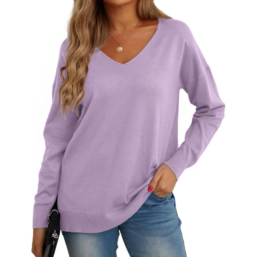 GRECERELLE Women’s V-Neck Long Sleeve Side Split Loose Casual Knit Pullover Sweater Blouse(Purple Gray)