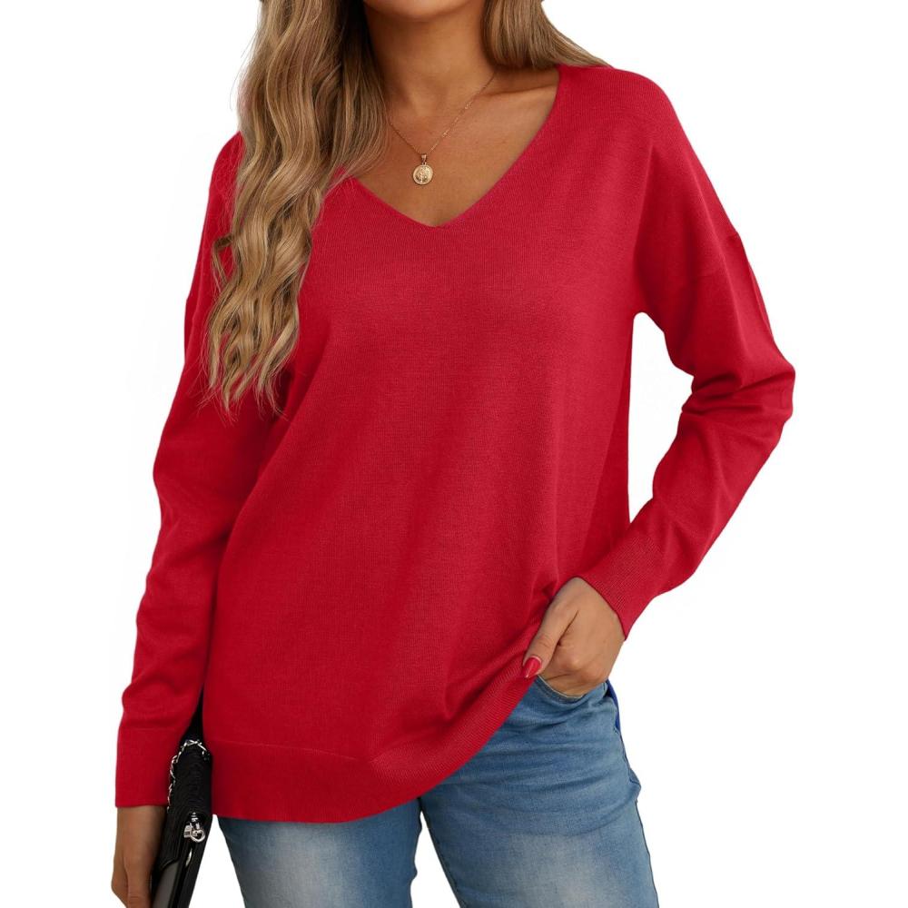GRECERELLE Women’s V-Neck Long Sleeve Side Split Loose Casual Knit Pullover Sweater Blouse(Red)