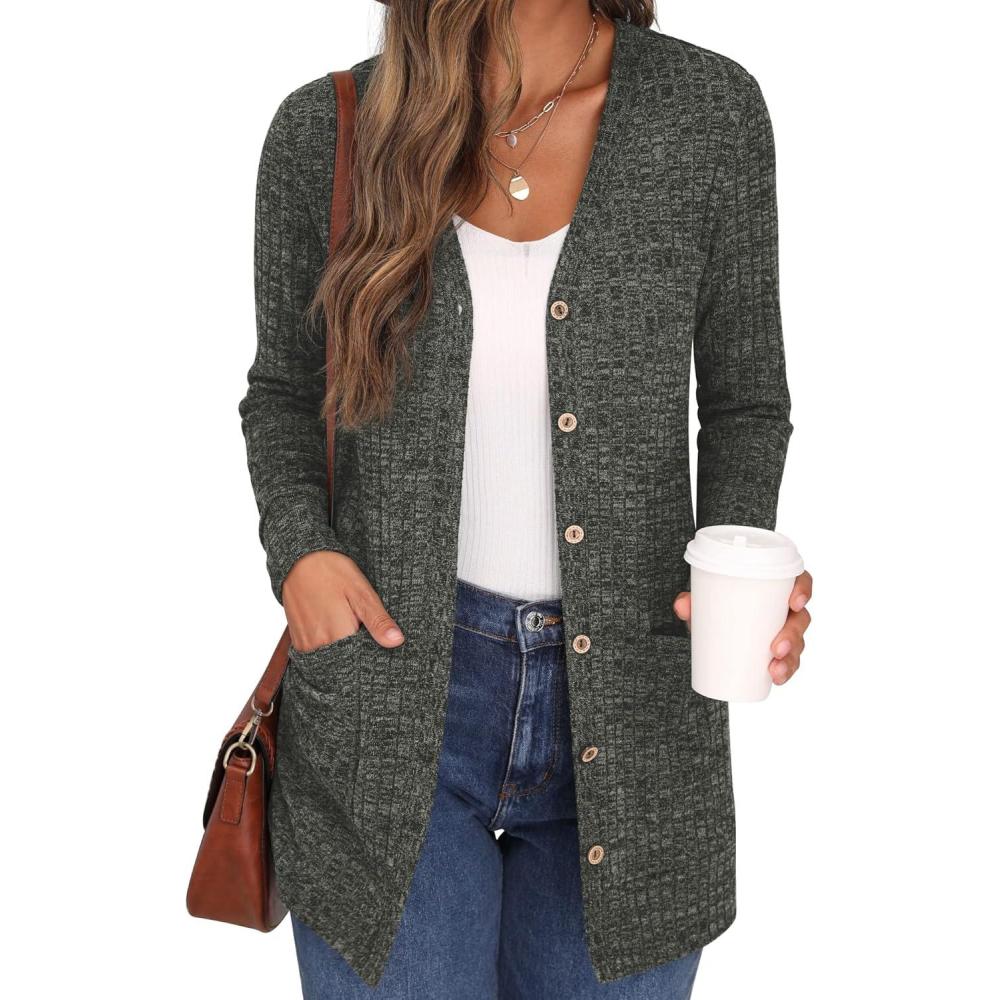 GRECERELLE Women’s Long Sleeve Open Front Cardigan Button Down Ribbed Lightweight Knit Outerwear with Pocket(02 Dark Gray)