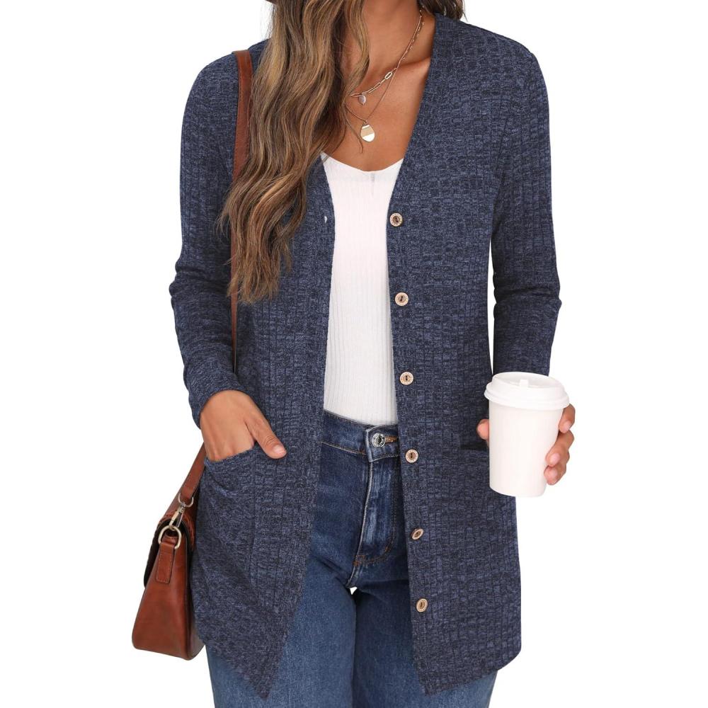 GRECERELLE Women’s Long Sleeve Open Front Cardigan Button Down Ribbed Lightweight Knit Outerwear with Pocket(06 Navy Blue)