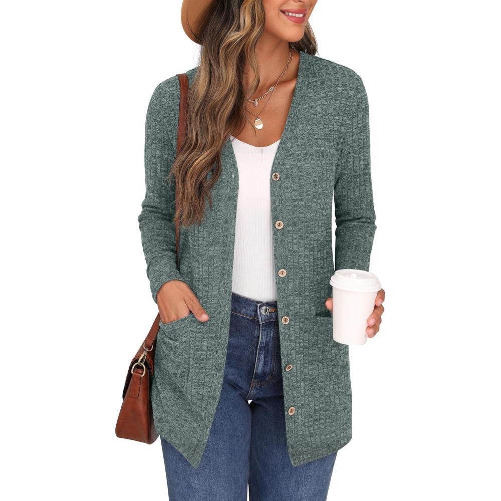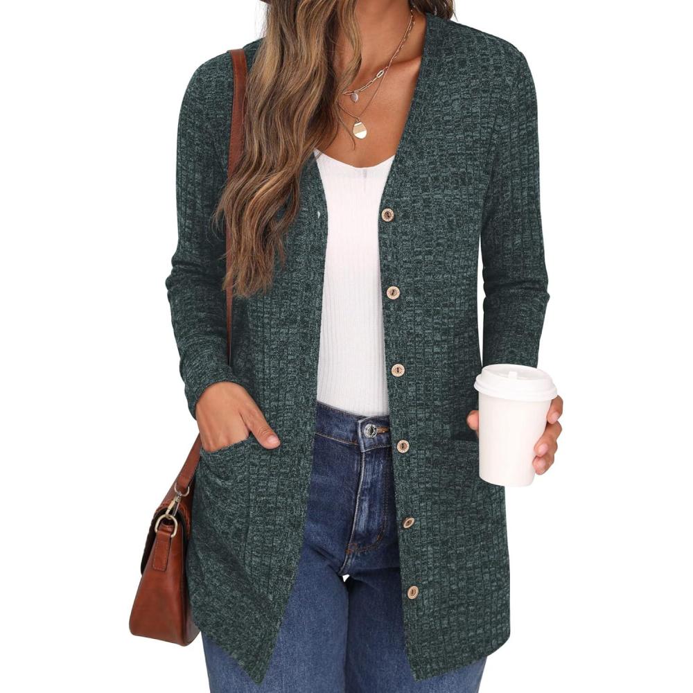 GRECERELLE Women’s Long Sleeve Open Front Cardigan Button Down Ribbed Lightweight Knit Outerwear with Pocket(07 Dark Green)