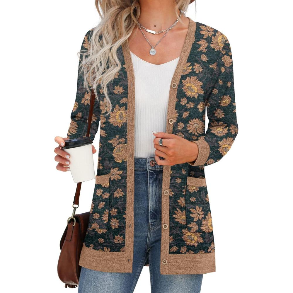 GRECERELLE Women’s Long Sleeve Open Front Cardigan Button Down Ribbed Lightweight Knit Outerwear with Pocket(A-round Flower Brown)