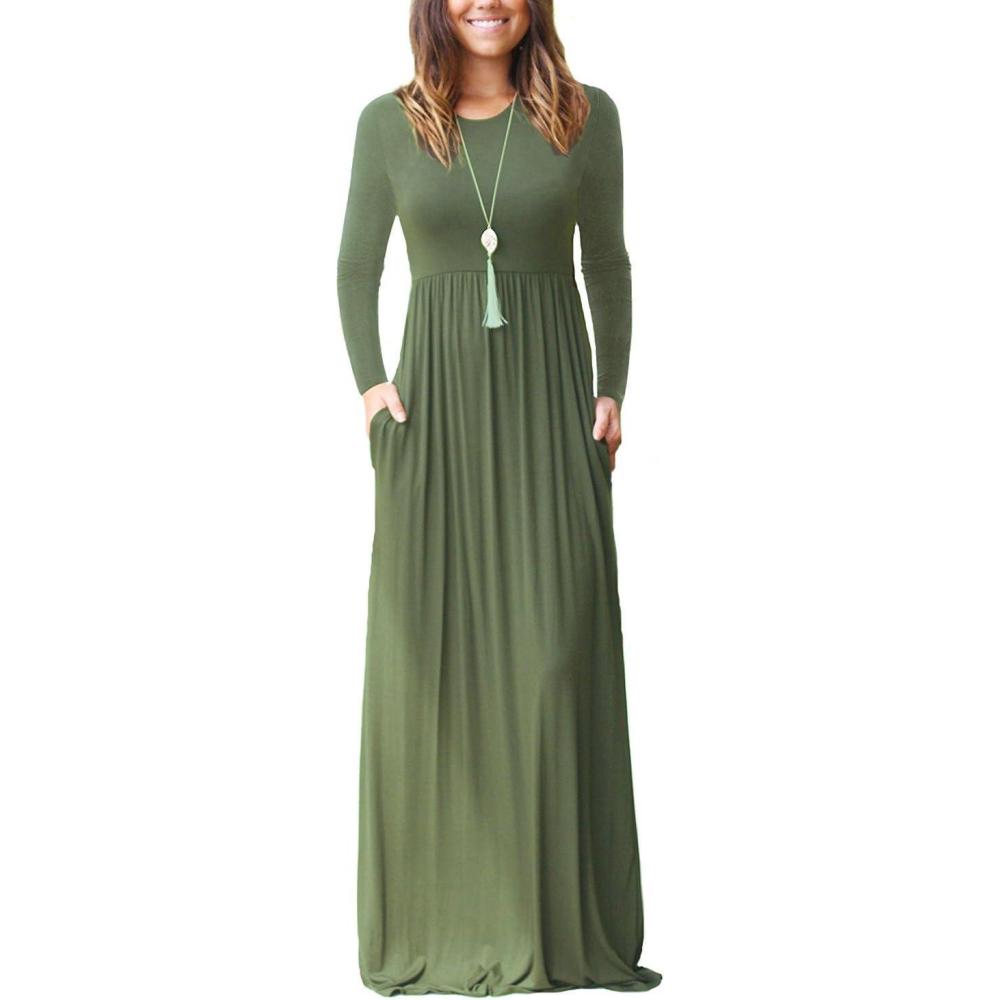 GRECERELLE Women Long Sleeve Casual Round Neck Loose Solid Floral Maxi Long Dress with Pockets, S-3XL(Army Green)