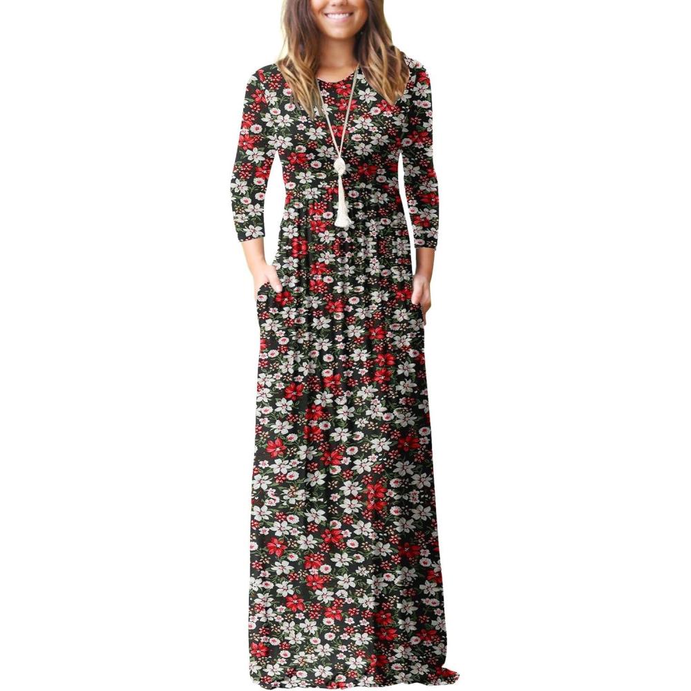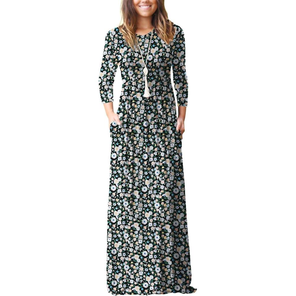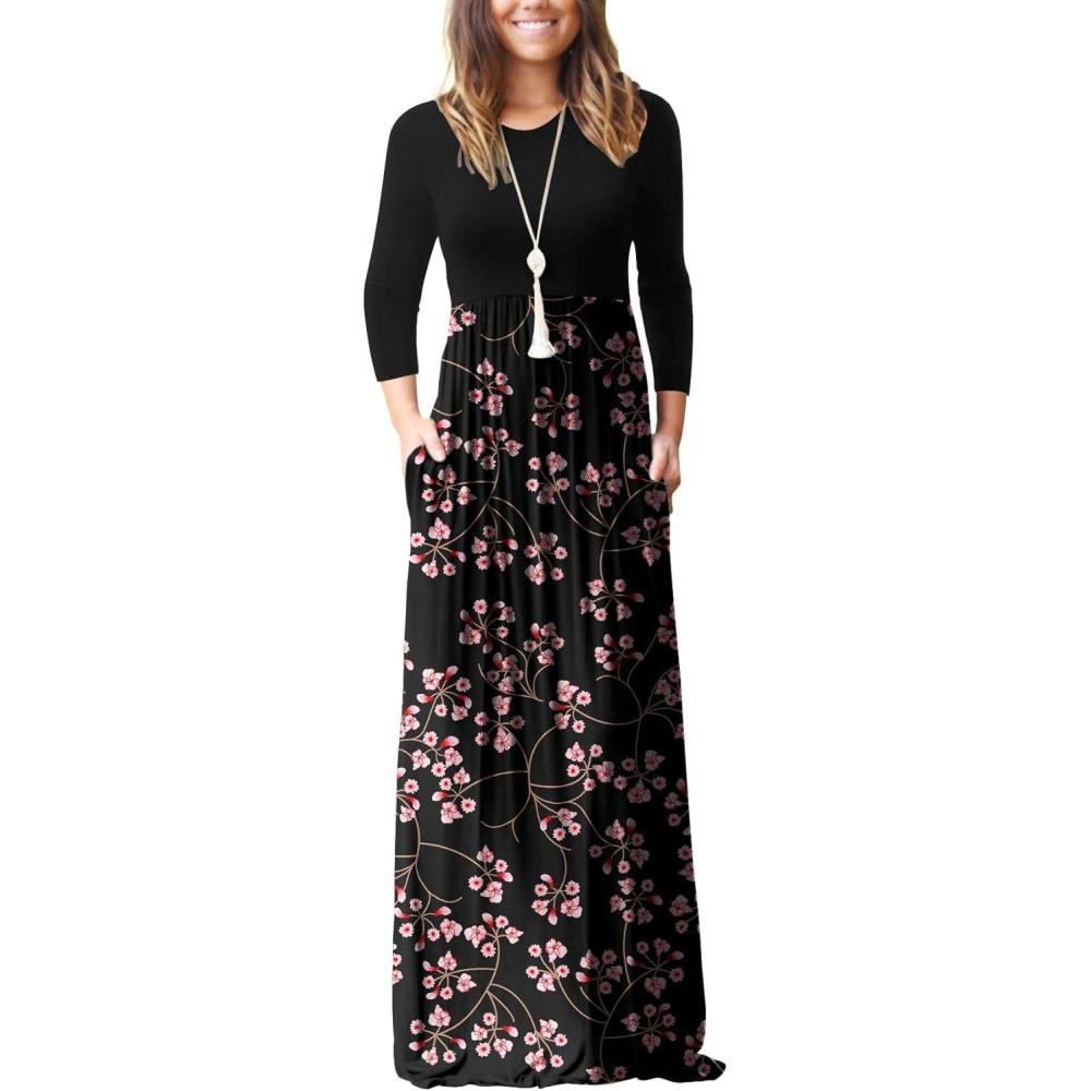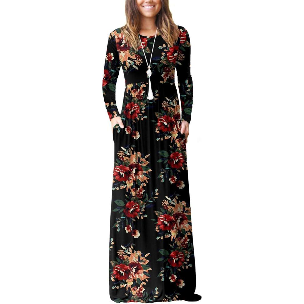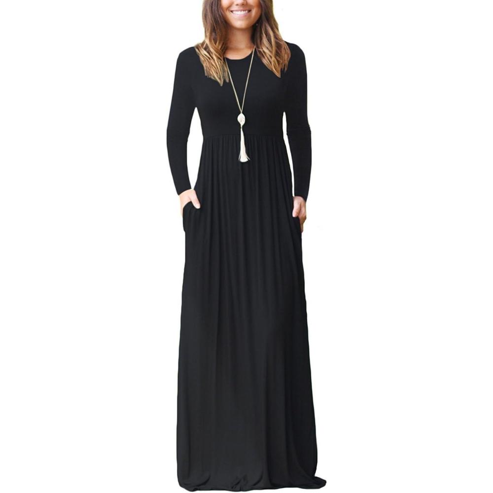 GRECERELLE Women Long Sleeve Casual Round Neck Loose Solid Floral Maxi Long Dress with Pockets, S-3XL(Black)
