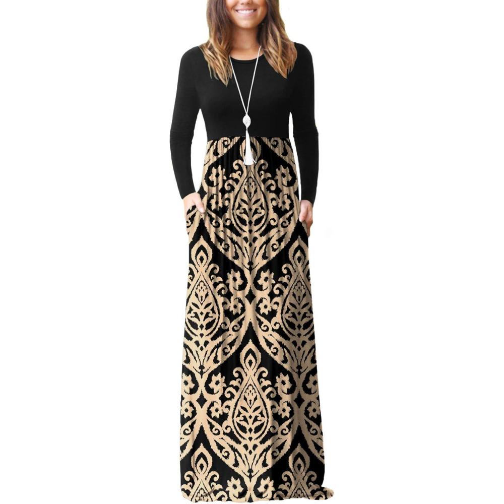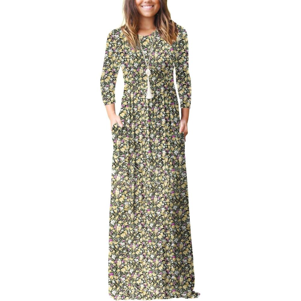 GRECERELLE Women Long Sleeve Casual Round Neck Loose Solid Floral Maxi Long Dress with Pockets, S-3XL(Black Yellow)