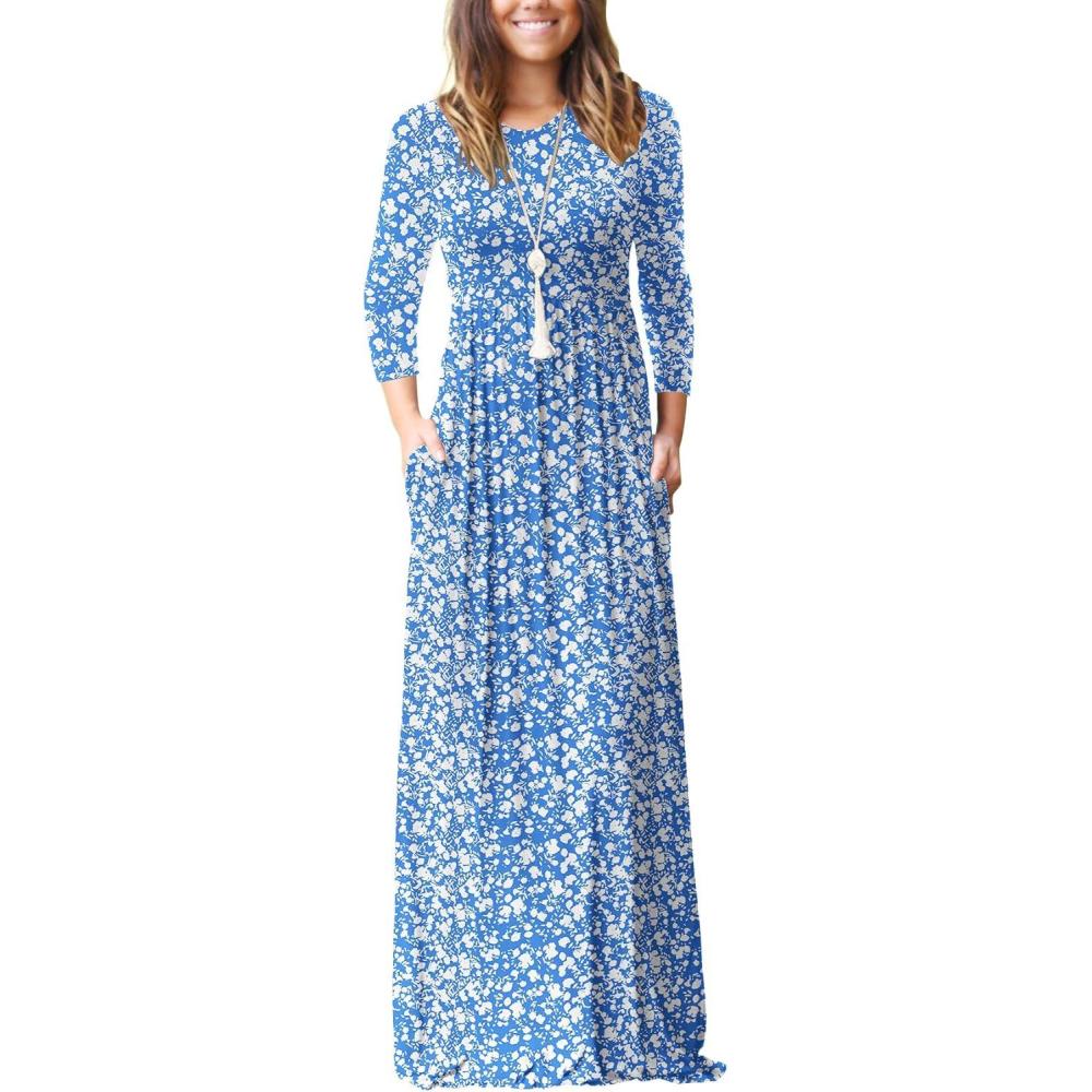 GRECERELLE Women Long Sleeve Casual Round Neck Loose Solid Floral Maxi Long Dress with Pockets, S-3XL(Blue Flowers White)