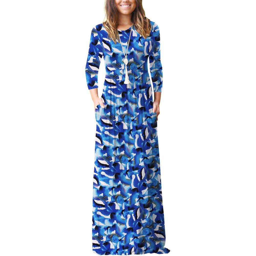 GRECERELLE Women Long Sleeve Casual Round Neck Loose Solid Floral Maxi Long Dress with Pockets, S-3XL(Blue Ink White)