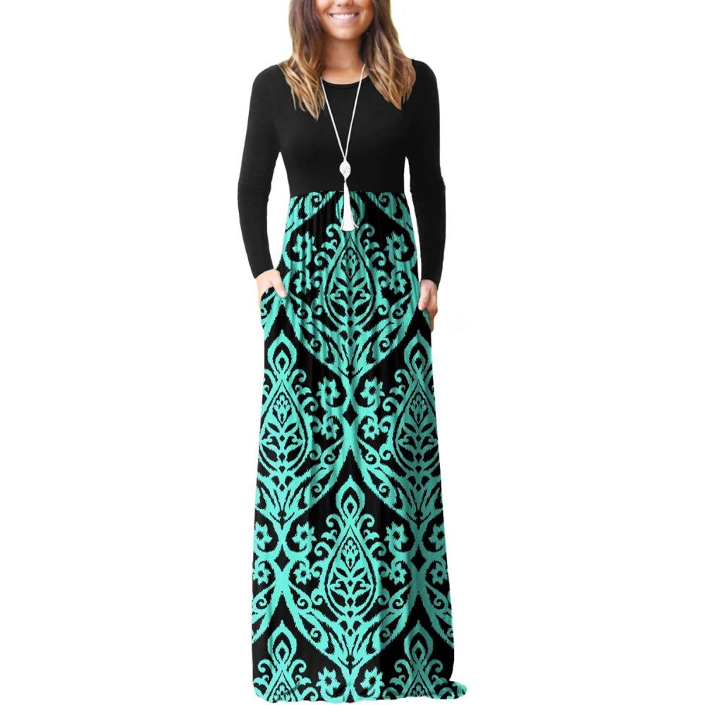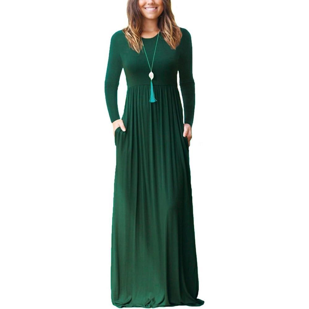 GRECERELLE Women Long Sleeve Casual Round Neck Loose Solid Floral Maxi Long Dress with Pockets, S-3XL(Dark Green)