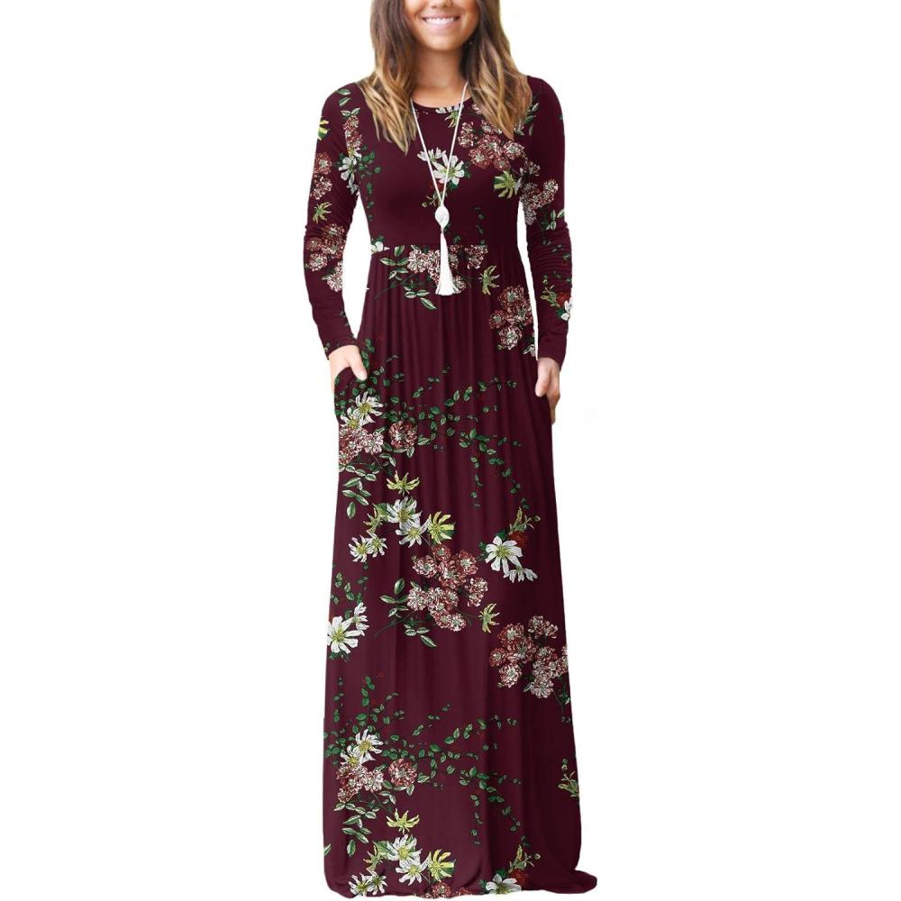 GRECERELLE Women Long Sleeve Casual Round Neck Loose Solid Floral Maxi Long Dress with Pockets, S-3XL(Flowers Wine Red)
