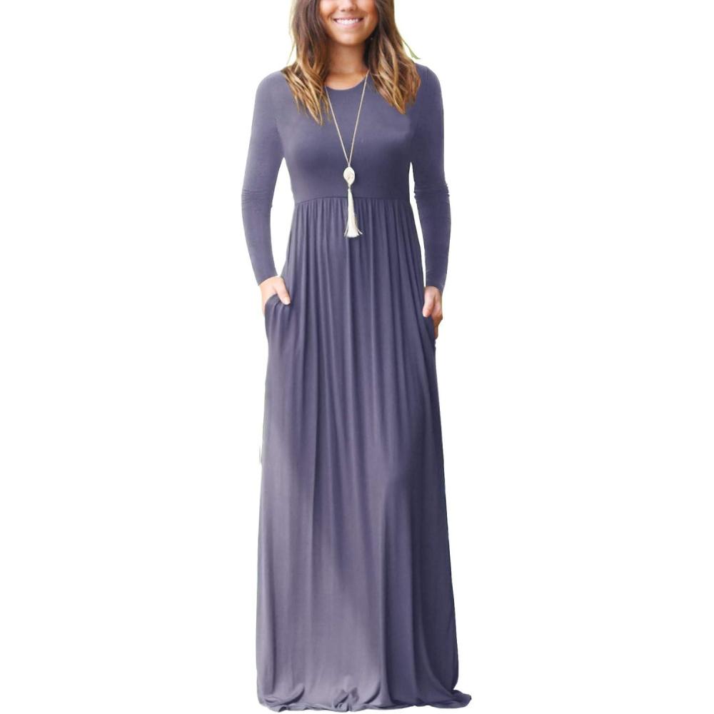 GRECERELLE Women Long Sleeve Casual Round Neck Loose Solid Floral Maxi Long Dress with Pockets, S-3XL(Gray)
