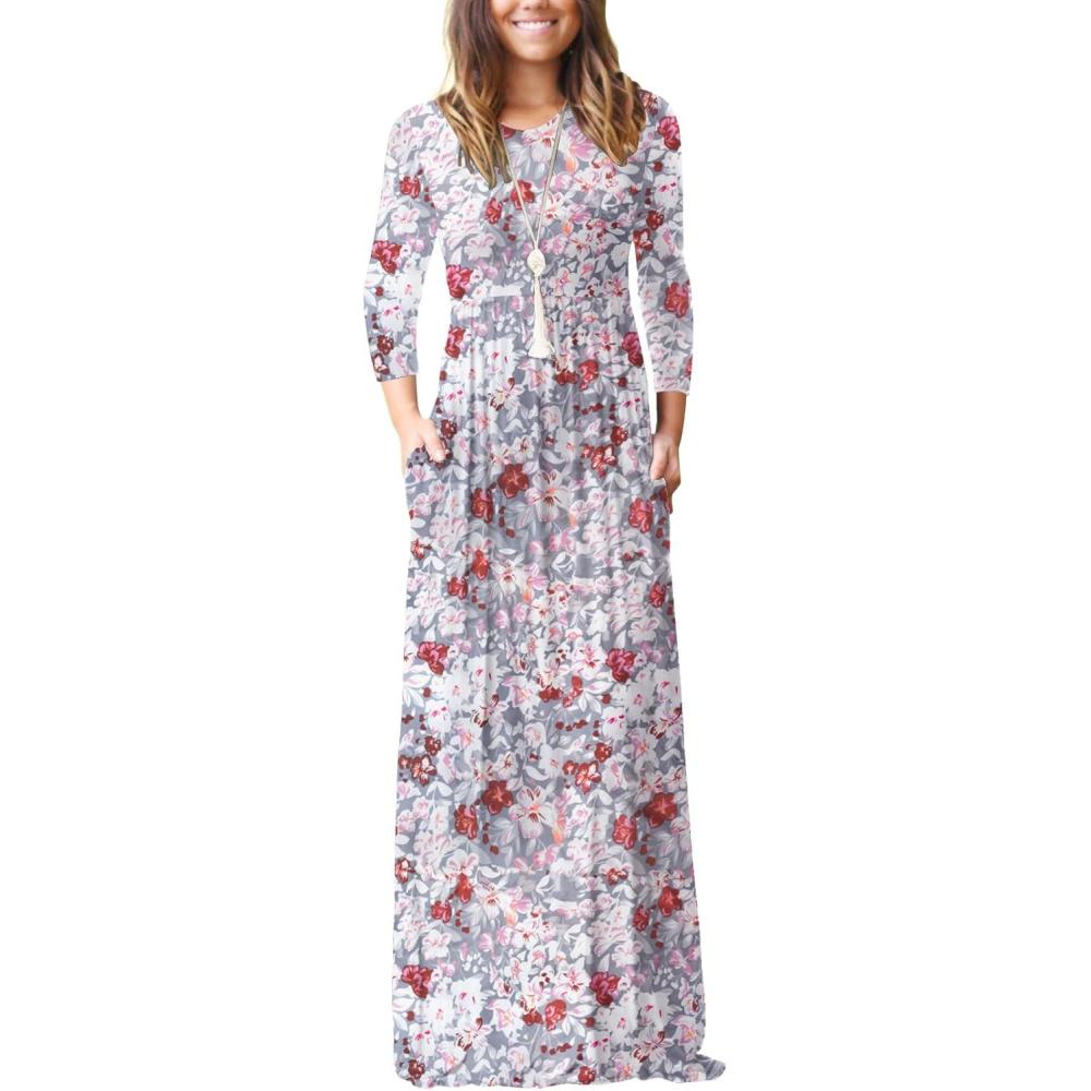 GRECERELLE Women Long Sleeve Casual Round Neck Loose Solid Floral Maxi Long Dress with Pockets, S-3XL(Gray Azalea)