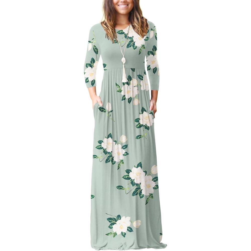 GRECERELLE Women Long Sleeve Casual Round Neck Loose Solid Floral Maxi Long Dress with Pockets, S-3XL(Green Camellia)