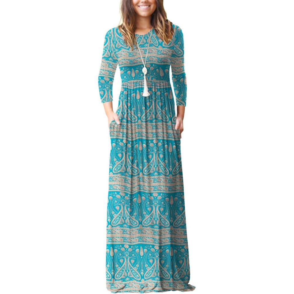 GRECERELLE Women Long Sleeve Casual Round Neck Loose Solid Floral Maxi Long Dress with Pockets, S-3XL(Flowers Blue Green)