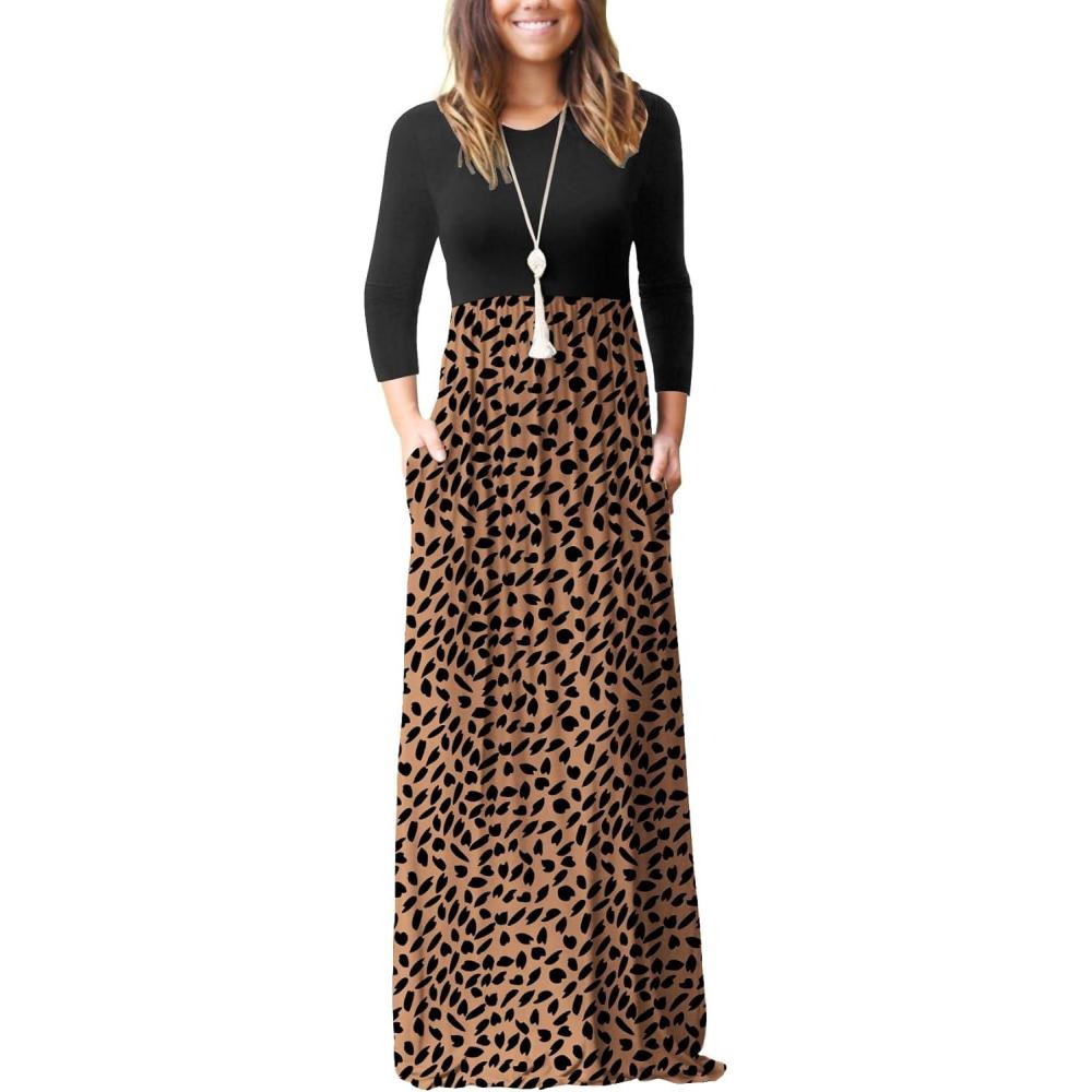 GRECERELLE Women Long Sleeve Casual Round Neck Loose Solid Floral Maxi Long Dress with Pockets, S-3XL(Flowers Brown Black)