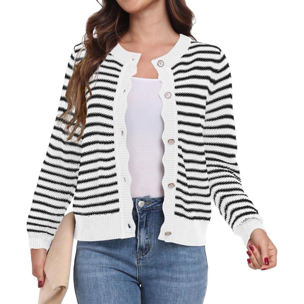 GRECERELLE Women Knit Cardigan Sweaters Long Sleeve Open Front Button Down Casual Trendy Jackets Outwear(Striped-white Black)