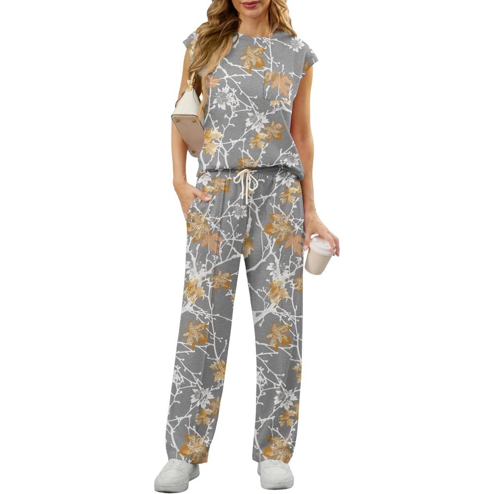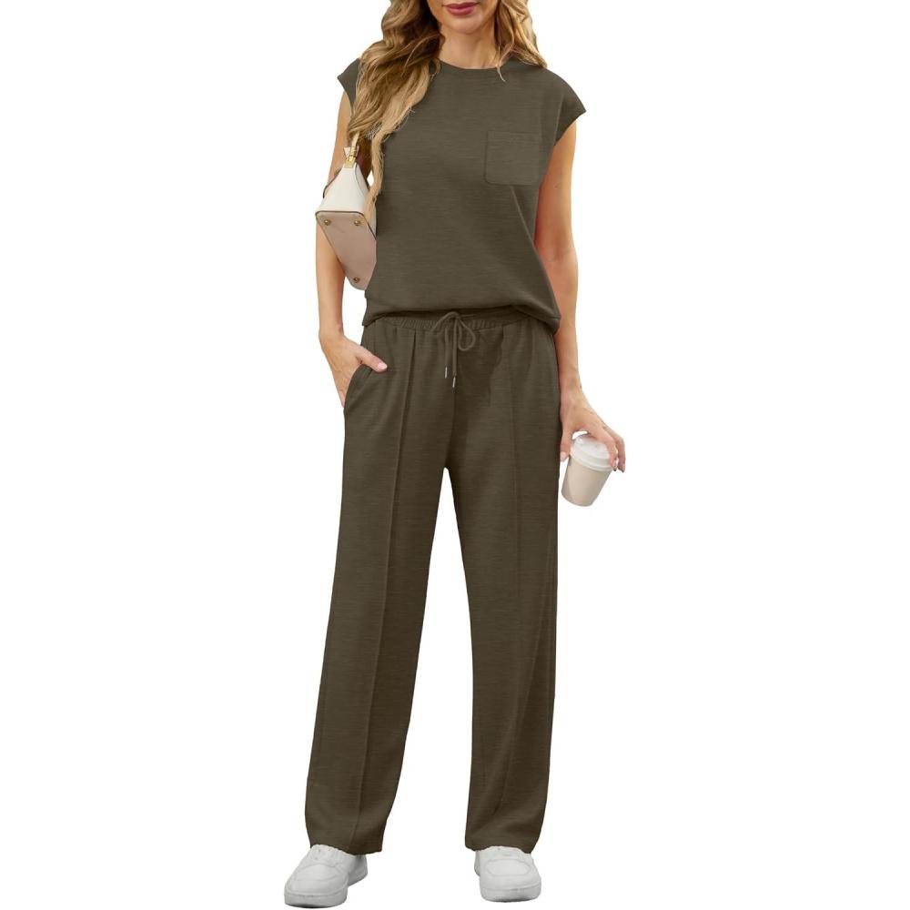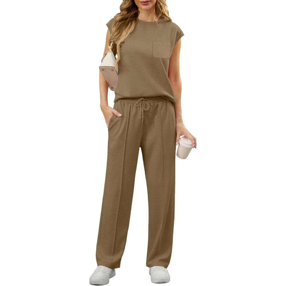 GRECERELLE 2 Piece Sets For Women Summer 2026 Outfits Lounge Sets Sleeveless Sweatsuits Wide Leg Tracksuits With Pockets(Fp-mussy Branche Maple)