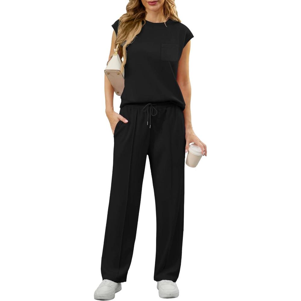 GRECERELLE 2 Piece Sets For Women Summer 2026 Outfits Lounge Sets Sleeveless Sweatsuits Wide Leg Tracksuits With Pockets(Black)