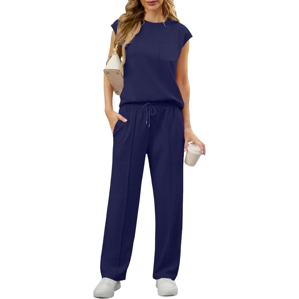 GRECERELLE 2 Piece Sets For Women Summer 2026 Outfits Lounge Sets Sleeveless Sweatsuits Wide Leg Tracksuits With Pockets(Dark Blue)