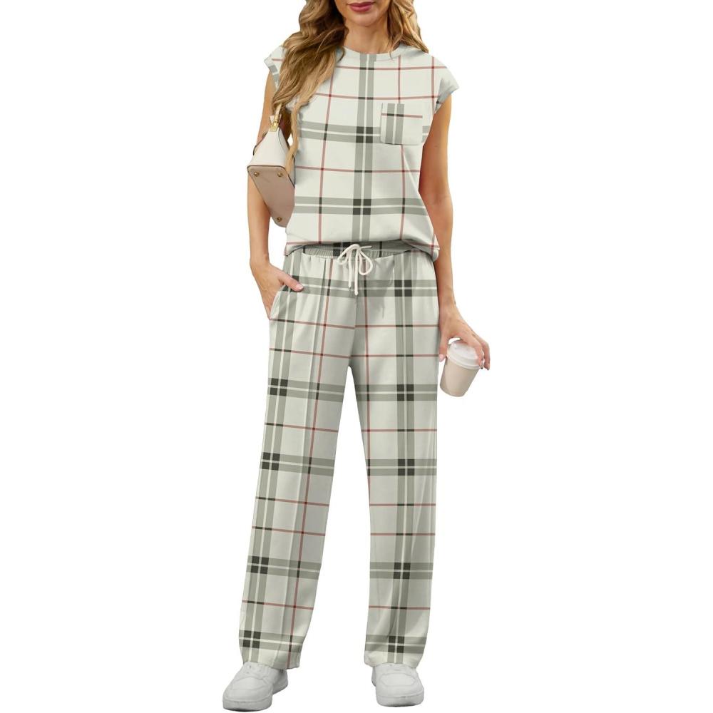 GRECERELLE 2 Piece Sets For Women Summer 2026 Outfits Lounge Sets Sleeveless Sweatsuits Wide Leg Tracksuits With Pockets(Fp-beige Red Plaid)