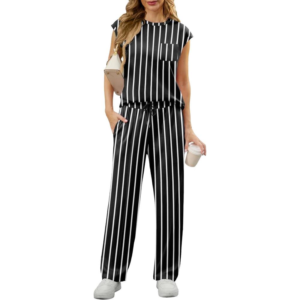 GRECERELLE 2 Piece Sets For Women Summer 2026 Outfits Lounge Sets Sleeveless Sweatsuits Wide Leg Tracksuits With Pockets(Fp-black White Stripe)
