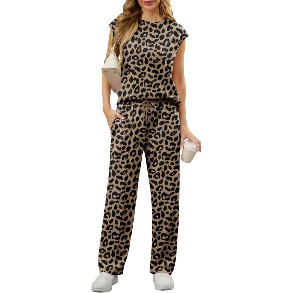 GRECERELLE 2 Piece Sets For Women Summer 2026 Outfits Lounge Sets Sleeveless Sweatsuits Wide Leg Tracksuits With Pockets(Fp-leopard Khaki)