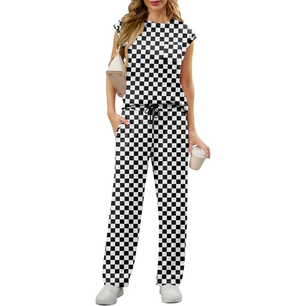 GRECERELLE 2 Piece Sets For Women Summer 2026 Outfits Lounge Sets Sleeveless Sweatsuits Wide Leg Tracksuits With Pockets(Fp-white Black Plaid)