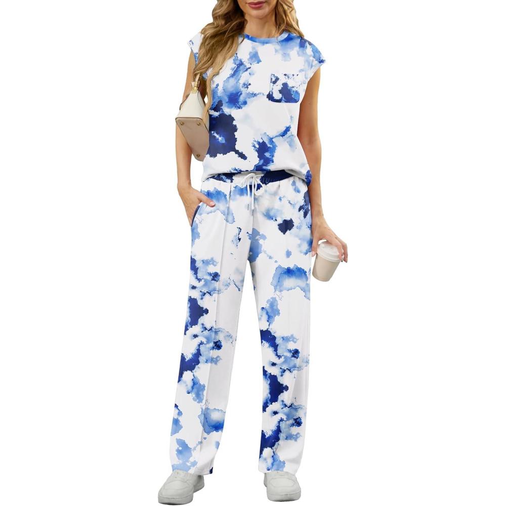 GRECERELLE 2 Piece Sets For Women Summer 2026 Outfits Lounge Sets Sleeveless Sweatsuits Wide Leg Tracksuits With Pockets(Fp-white Ink Blue)