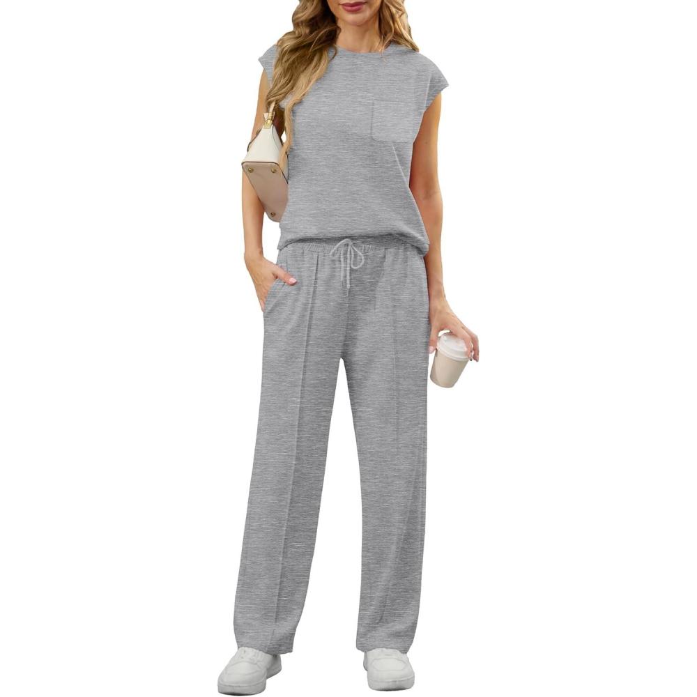 GRECERELLE 2 Piece Sets For Women Summer 2026 Outfits Lounge Sets Sleeveless Sweatsuits Wide Leg Tracksuits With Pockets(Grey)
