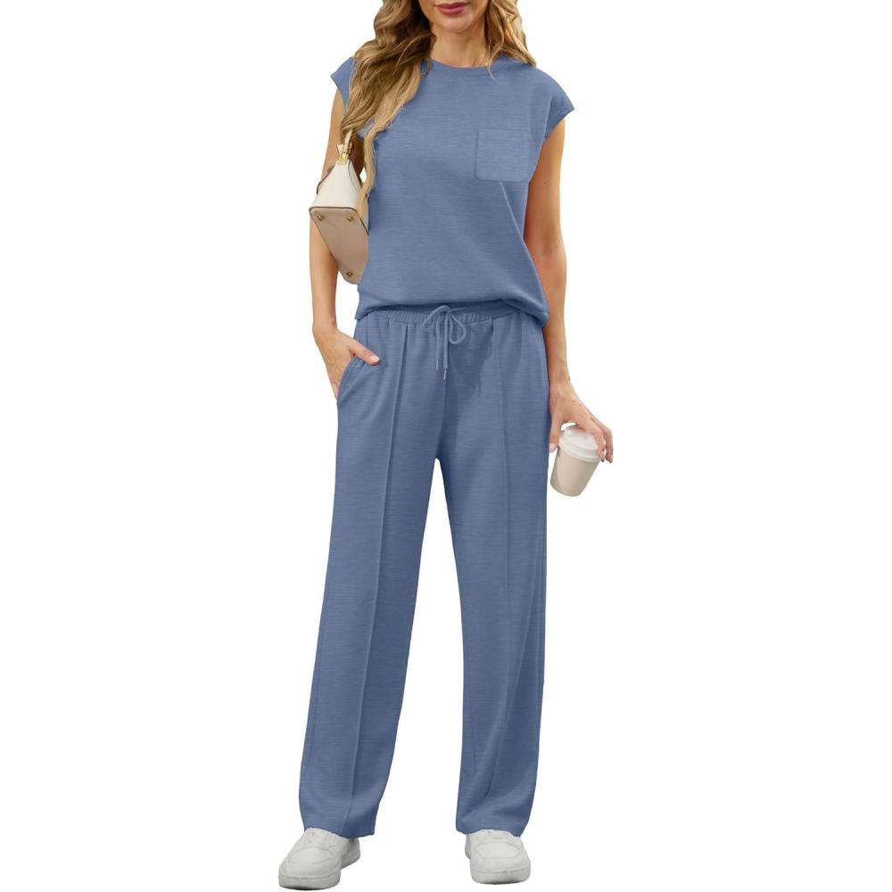 GRECERELLE 2 Piece Sets For Women Summer 2026 Outfits Lounge Sets Sleeveless Sweatsuits Wide Leg Tracksuits With Pockets(Haze Blue)