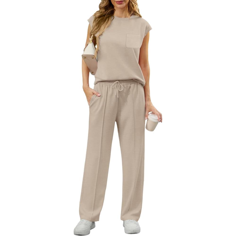GRECERELLE 2 Piece Sets For Women Summer 2026 Outfits Lounge Sets Sleeveless Sweatsuits Wide Leg Tracksuits With Pockets(Apricot)